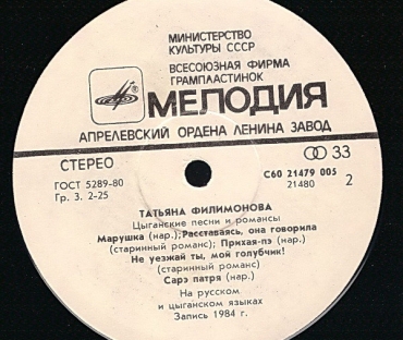 Вы здесьГлавная » КУПИТЬ ВИНИЛОВЫЕ ПЛАСТИНКИ » Цыганские песни все товары » Татьяна Филимонова Цыганские песни и Романсы